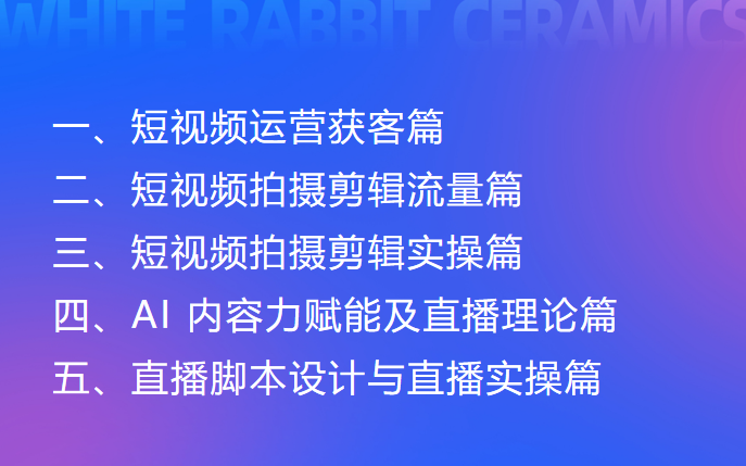 “白兔瓷磚2025新媒體101計(jì)劃”培訓(xùn)準(zhǔn)備了五大精品課程,涵蓋短視頻運(yùn)營(yíng)獲客、拍攝剪輯技巧、內(nèi)容創(chuàng)意賦能、直播腳本設(shè)計(jì)與實(shí)操等全流程技能,無論是短視頻剪輯新手,還是希望提升爆款內(nèi)容策劃、私域轉(zhuǎn)化能力的進(jìn)階學(xué)員,都能通過線下集訓(xùn)、線上訓(xùn)練營(yíng)和社群伴教等多種形式,獲得針對(duì)性提升。